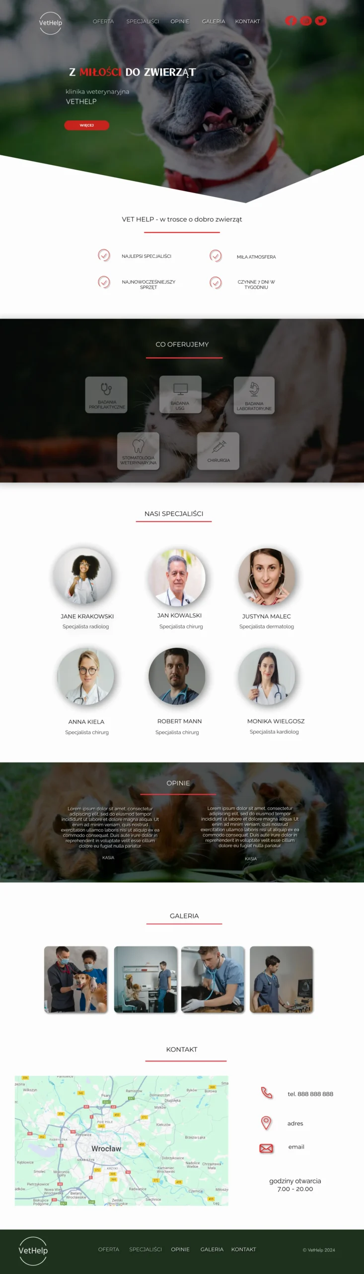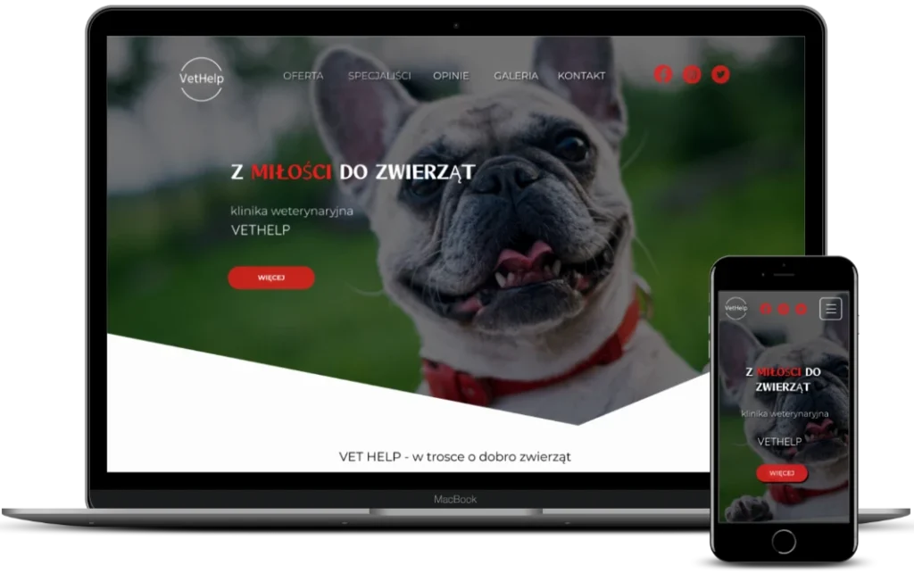 Projekt strony internetowej kliniki weterynaryjnej typu one-page, jest przykładem nowoczesnego podejścia do projektowania stron medycznych. Strona jest skonstruowana w sposób umożliwiający łatwą nawigację i szybki dostęp do kluczowych informacji, co jest szczególnie istotne dla właścicieli zwierząt poszukujących profesjonalnej opieki weterynaryjnej.
